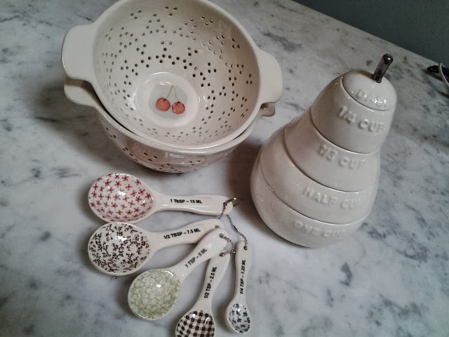 Bake up a storm with these great pieces? Crafted from cream porcelain with just enough whimsy to add to the fun; pear shaped measuring cups, patterned measuring spoons, mini colanders perfect for holding freshly washed summer cherries, and more!
